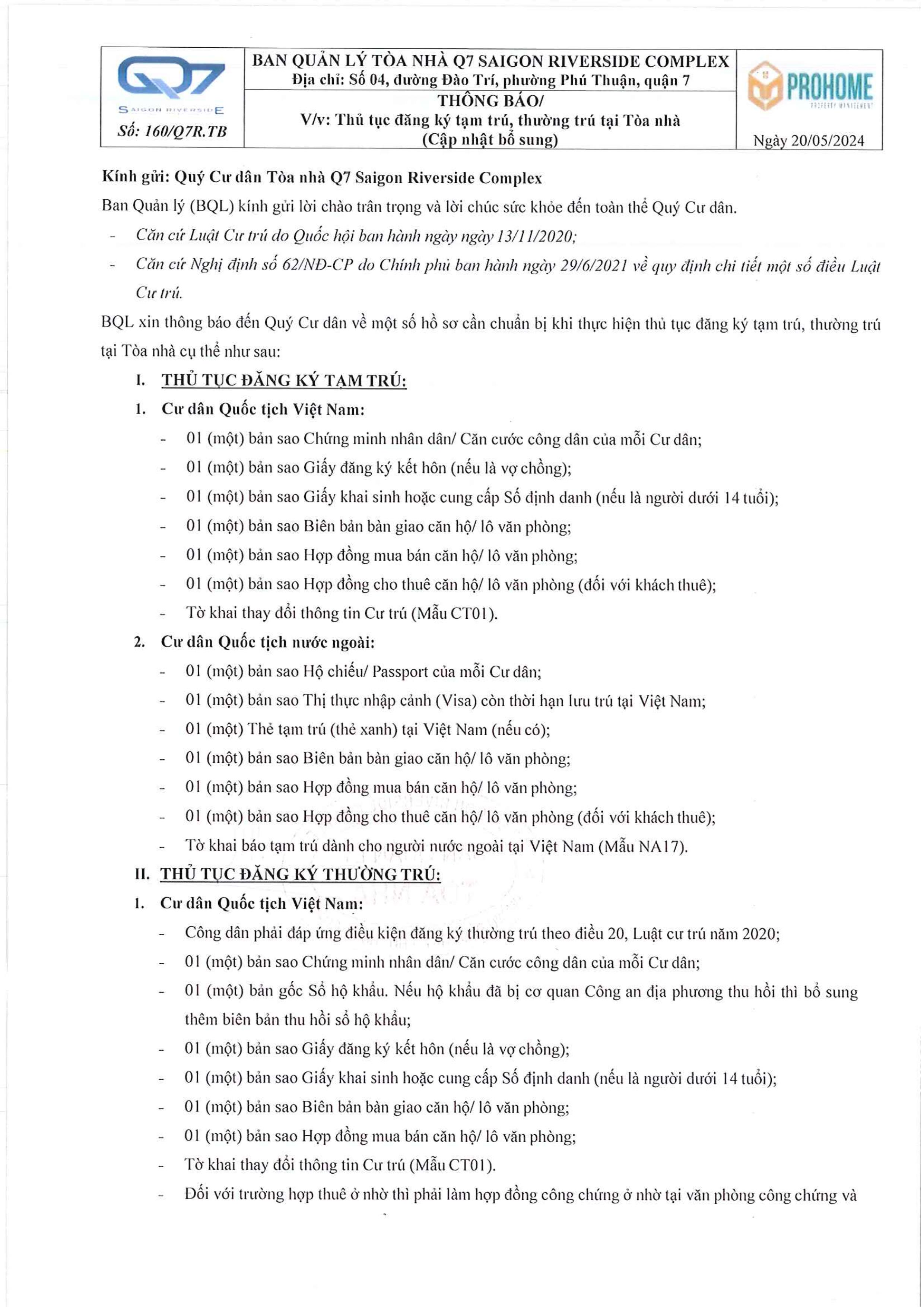BQL xin gửi đến Quý Cư dân Thông báo số 160 Hướng dẫn thủ tục đăng ký tạm trú, thường trú tại Tòa nhà (Cập nhật bổ sung)